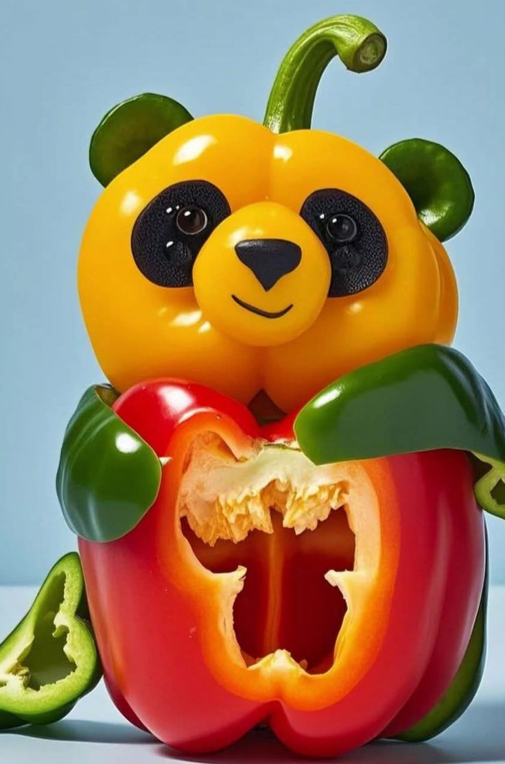 Изображение представляет собой креативную композицию из сладких перцев, изображающую фигуру панды. Голова панды выполнена из жёлтого перца, с чёрными пятнами вокруг глаз и носом, которые добавляют сходство с реальным животным. Уши оформлены зелёными кусочками перца. Центральный элемент композиции — красный перец, который изображает тело. В центре этого "тела" видна пустота с семенами, что добавляет необычности. Композиция освещена ярко, что подчёркивает глянцевую текстуру перцев. На фоне представлен однотонный голубой цвет, который создает контраст с насыщенными цветами перцев. Общая атмосфера работы лёгкая и игривая, что может символизировать творчество и экологическое сознание. Изображение может быть привлечением внимания к важности полувегетарианского стиля жизни.