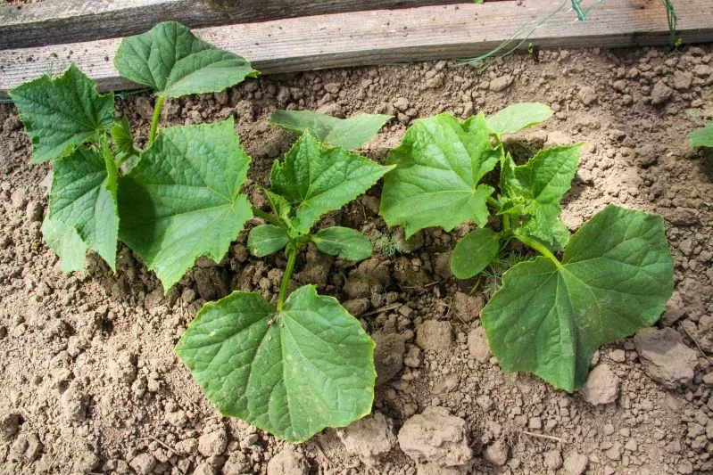 На изображении представлены молодые растения огурцов, посаженные в открытый грунт. Их листья имеют насыщенный зелёный цвет и крупную текстуру, с выраженными прожилками. Видно, что растения аккуратно расположены в ряд в рыхлой светло-коричневой почве, характерной для плодородного сельскохозяйственного участка. На заднем фоне видна деревянная рейка, которая может служить для разграничения грядок или укрепления растений. Текстура почвы свидетельствует о хорошем уровне ухода и полива. Общий вид растения создаёт атмосферу начала активного роста. Контраст между зелёными листьями и светлой почвой подчёркивает здоровье растений. Поскольку огурцы растут, как на дрожжах, на ум приходят фермерские методы, которые часто держатся в секрете, чтобы не потерять прибыль. Это даёт подсказку об эффективном методе ухода, о котором нечасто рассказывают даже опытные огородники.