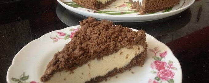 На изображении показан кусок творожного торта, оформленного на белой тарелке с цветочным узором. Основа торта имеет коричневый оттенок, что указывает на использование шоколадного или какао-теста. В центре виден толстый слой светлой творожной массы, что придает контраст и выраженную текстуру блюду. На заднем плане, на блюде с зелеными полосками, виден аналогичный торт, нарезанный на несколько кусочков. Поверхность стола, на котором разместились тарелки, выполнена из темного материала, вероятно, мрамора или черного гранита, что подчеркивает изысканность сервировки. Освещение мягкое, подчеркивающее аппетитные оттенки торта и делая его ещё более привлекательным на тёмном фоне. Изображение создает уютную и гостеприимную атмосферу, передавая ощущение домашнего уюта и теплоты. Такая подача вызывает чувство спокойствия и наслаждения от умелого приготовления домашних сладостей. Рядом с изображением располагается текст "Творожный торт - 10 вкусных рецептов с домашних условиях с пошаговыми фото".