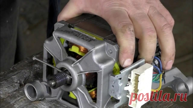 На изображении представлен электродвигатель, очевидно, от стиральной машины, на котором крепко лежит мужская рука. Корпус двигателя выполнен из серого металла с четкими геометрическими формами. Видны яркие медные обмотки, что указывает на электрическую природу устройства. Толстый металлический вал выходит из центра двигателя, на котором, возможно, планируется замена шкива. Руководство данной темы, предложенное видео на YouTube канале Egoiste company, описывает, как выполнить замену шкива на моторе стиральной машины варварским методом без использования специального съемника, что добавляет элемент практичности и креативности. Освещение равномерное, позволяющее ясно видеть все детали устройства. На заднем плане можно заметить деревянную поверхность, вероятно, рабочий верстак. Композиция изображения четко сфокусирована на центральном элементе— моторе, что подчеркивает технический аспект сцены. Атмосфера изображения нейтральная и нацелена на механическую работу.