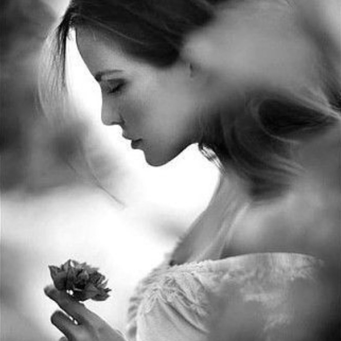 На черно-белой фотографии изображена молодая женщина в профиль, держащая в руках небольшой цветок. Светлая, еле уловимая улыбка на ее лице создает атмосферу задумчивости и спокойствия. Она одета в светлое, возможно кружевное платье, подчеркивающее нежность и романтический стиль кадра. Женщина слегка склонила голову, глядя на цветок с лёгким любопытством и трепетом, что вызывает ассоциации с надеждой и верой в чудеса. Волосы её распущены и слегка развеваются на ветру, создавая живой и естественный образ. Фон изображения размыт, что помогает сфокусировать внимание на центральной фигуре и цветке, усиливая эффект интимной сцены. Освещение мягкое, правдоподобно естественное, добавляющее глубины и текстуры изображению.