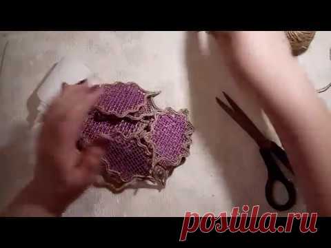 На изображении видны руки человека, работающего над созданием декоративных элементов. Центральный объект — фигурка, состоящая из джута и фиолетовой текстильной ткани. Джут имеет грубую текстуру, оттеняется приглушенным коричневым цветом. Ткань фиолетового цвета добавляет контраст и создает ощущение глубины. Руки разнятся: одна в процессе фиксации, другая поддерживает деталь. На заднем плане видны ножницы с черными пластиковыми ручками, свидетельствующие о процессе создания рукодельных предметов. Свет мягкий, равномерно распределенный, фокус на центре композиции обеспечивает ясное восприятие деталей. В помещении царит спокойная, сосредоточенная атмосфера, характерная для творческого процесса. На фоне виден текст "Как сделать цветы из джута. Часть 1 М.К.", что подразумевает руководство или мастер-класс по изготовлению джутовых цветов.