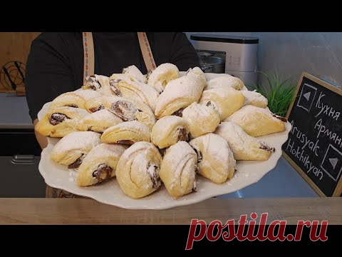 На изображении человек держит большое круглое блюдо с аппетитными выпечками, посыпанными сахарной пудрой. Выпечка находится на белой тарелке, и, судя по виду теста и начинке, это могут быть булочки с шоколадной или фруктовой начинкой. Человек одет в тёмную одежду с фартуком, фон выполнен в тёплых нейтральных тонах. На заднем плане заметна меловая доска с надписями на русском языке, где указано что-то, связанное с кухней. Светло-голубоватое освещение создаёт уютную атмосферу небольшого кафе или кухни. Отдельные элементы, такие как деревянная мебель и зелёное растение, добавляют натуральности интерьеру. Эти булочки обладают структурой, которая подчеркивается надписью "Тающая структура /Рассыпаются во рту/С начинкой", что указывает на их нежность и сочность.