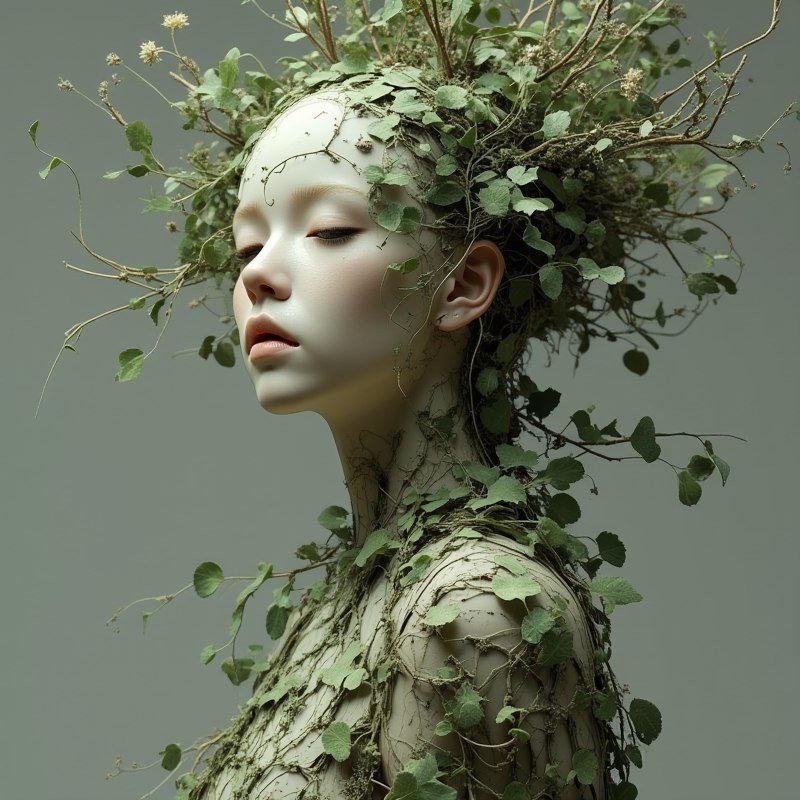 Женщина из лозы и листьев: гиперреалистичная скульптура в коллаже. Изображение из нейронной сети Flux - Flux.1 примеры промтов - Форум ИИ о нейросетях - Yes Ai