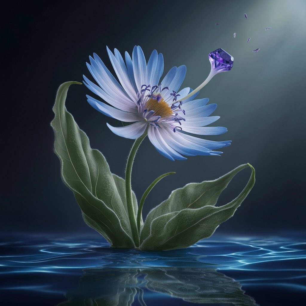 На изображении изображен одиночный цветок с крупными лепестками нежного голубого оттенка, преломляющими свет. Цветок изящно возвышается над спокойной водной гладью, создавая атмосферу таинственности и утонченной красоты. В центре цветка виден яркий, фиолетовый элемент, напоминающий драгоценный камень, что добавляет изображению элемент сюрреализма. Над цветком, из-за направленного луча света, создается ощущение сосредоточенного внимания. Листва цветка насыщенно-зеленая с мягкой текстурой, контрастирующей с яркими лепестками. Вода, темная и глубокая, отражает лёгкие рябь на поверхности, подчеркивая спокойствие и гармонию композиции. Вместе эти элементы создают иллюзию того, что цветок как будто «растет» из воды, а луч света акцентирует его нежность и элегантность. Рядом располагается текст, который гармонично дополняет образ: "Объединять можно цветы общего облика или размещать их по принципу контраста. Есть виды, для которых очень трудно подобрать компаньонов." Это добавляет философский аспект к изображению, позволяя зрителю погрузиться в мысли о гармонии и контрасте в природе.
