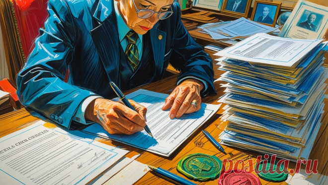 На изображении запечатлена сцена в офисе нотариуса. В центре кадра сидит человек в костюме темно-синего цвета и галстуке, сосредоточенно подписывающий документы. На столе перед ним лежат стопки бумаги и несколько ручек. На задник стола видны личные фотографии в рамках, что добавляет теплоту профессиональной атмосфере. Обстановка подчёркивает официальную атмосферу, с документами аккуратно разложенными на столе. Человек носит очки и серьёзно сосредоточен на своей работе, что говорит о его профессионализме и ответственности. Освещение в комнате мягкое, с оттенком теплого света, создавая комфортную рабочую среду. Видно использование различных печатей и штампов на документах. Ниже представлено название "Сколько придется заплатить нотариусу за вступление в наследство в 2025 году | Юридический навигатор: от прав к решениям | Дзен", что предполагает тему юридической консультации и вопроса наследства.