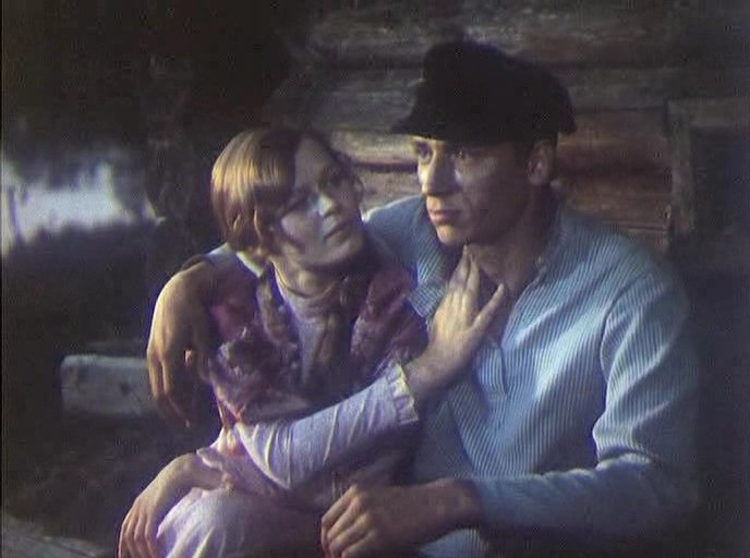 На изображении запечатлена пара в деревенской обстановке. Мужчина в полосатой рубашке и черной кепке сидит, делая задумчивое выражение лица, его взгляд устремлен вдаль. Женщина рядом с ним, укутанная в теплый платок с узорами, нежно обнимает его за плечо и смотрит на него с ласковой улыбкой. Их позы передают близость и доверие, создавая уютную и меланхоличную атмосферу. Фон выполнен в темных тонах, представленный рубленой деревянной стеной, усиливая чувство уединения и сельскую аутентичность. В помещении царит тусклое освещение, создавая мягкие тени и теплый цветовой баланс. Композиция акцентирует внимание на человеческой связи и чувственных эмоциях, заключенных в простоте момента. Изображение связано с советской культурой и кино 1970-х годов, отражая традиционный социальный уклад и семью как центральную ценность той эпохи.