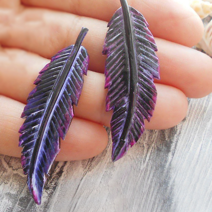 Изображение демонстрирует две искусные фигурки в виде перьев, лежащие на фоне чьей-то ладони. Эти перья, выполненные из полимерной глины, имеют насыщенные фиолетовые и черные оттенки, создавая впечатление глубины и текстурности. Каждое перо обладает четкими, детализированными прожилками и изгибами, имитирующими природные жилки перьев. На поверхности перьев заметен блеск, который придает им дополнительный эффект реалистичности. Фон представляет собой нежную, светлокоричневую поверхность, возможно, деревянную, создавая контраст для изделия. Изделия такого рода часто используются в качестве декоративных элементов или аксессуаров. На фото также можно заметить водяной знак сайта, что говорит о его происхождении.