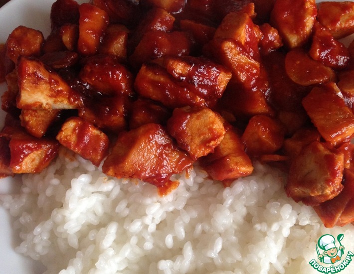 - Курицу порезать кусочками. Сковороду разогреть, налить масла и обжарить курицу со всех сторон. Выложить в отдельную тарелку. Чеснок порезать тоненькими ломтиками. В чашке смешать 1 ст. л. томатной пасты, 100 мл яблочного сока, 1 ст. л. яблочного уксуса, 1 ст. л. соевого соуса. Добавить 1ст. л. сахара, специи на кончике ножа. Хорошенько размешать. В сковороду выложить чеснок, залить получившимся соусом и тушить на среднем огне без крышке 4 минуты. Выложить в сковороду обжаренную курицу, хорошенько перемешать и тушить под крышкой на маленьком огне еще 5 минут. Готово! Подавать с отварным рисом или тушеными овощами.
