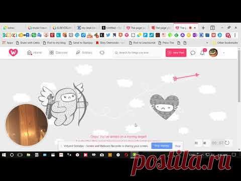 На изображении показан рабочий стол компьютера с открытым браузером на сайте "We Heart It". В верхней части виден оконный ряд вкладок, заполненный иконками различных сервисов и сайтов. Центральная часть экрана демонстрирует страницу сайта с иллюстрацией в виде нарисованного ангела с луком и стрелами и облаками на светло-сером фоне. Справа от ангела изображено сердце с лицом в центре. Сайт предоставляет возможность создания сердцевидной кнопки и поиска изображений. В нижней части скриншота также видна программа для видеозвонков и совместного использования экрана. Слева внизу пола также получилась отражающаяся фотография деревянной поверхности с лампой, которая создает теплую атмосферу вокруг.