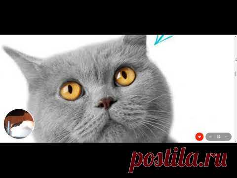 На изображении представлен крупный план серого британского короткошерстного кота с большими круглыми ярко-желтыми глазами. У кота густая пушистая шерсть, придающая ему очаровательный и умиротворенный вид. Фон изображения белый, что подчеркивает контраст яркой шерсти и выразительного взгляда животного. В левом нижнем углу виден небольшой круглый элемент, напоминающий вставку изображения или фотографию, содержащую размытую сцену с кроватью. В правом нижнем углу заметны элементы пользовательского интерфейса с красной кнопкой, типичной для видеоэкрана. В верхнем правом углу расположена маленькая голубая бумажная стрелка. Общая атмосфера изображения вызывает улыбку и чувство спокойствия, особенно благодаря спокойному и мягкому выражению мордочки кота.