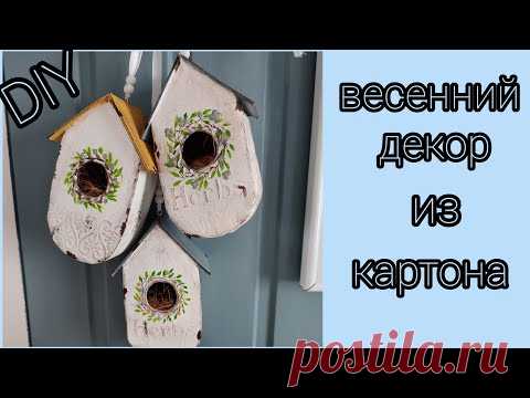 На изображении представлено три декоративных скворечника, сделанных из картона и покрытых белой краской с элементами декора. Эти скворечники имеют классическую форму с двускатной крышей, одна из которых окрашена в желтый цвет, добавляя яркость. На каждом скворечнике есть отверстие для птиц, которое окружено нарисованным венком из зеленых листьев. Рядом с одним из скворечников прикреплена небольшая крупа, создающая иллюзию натурального материала. Они висят на синем фоне, который может быть частью стены или двери. Надпись "DIY" размещена в верхнем левом углу, а в правой части на голубом фоне написано "весенний декор из картона", что указывает на тематику изображения и использование этих объектов в качестве весеннего украшения интерьера или сада.