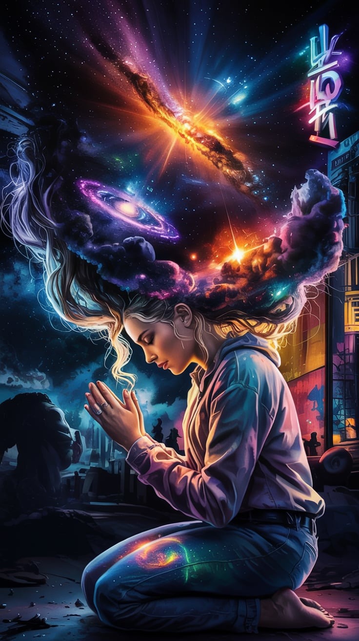 На изображении представлена молодая женщина, сидящая на коленях в позе молитвы. Она одета в светлую рубашку и джинсы с яркими галактическими узорами, что создает впечатление космической атмосферы. Из её головы вырывается поток звёзд, галактик и облаков, формируя межзвёздный фон. Вверху изображены яркие цветные вспышки и спиральные галактики, что придаёт изображению магический и фантастический вид. Фон состоит из ночного неба с множеством звёзд и силуэтов зданий. Очевидно, здесь искусство и фантазия сливаются в экстравагантном отображении Вселенной, пронзающей мысли и дух женщины. Эта картина символизирует внутреннюю связь между человеком и космосом.