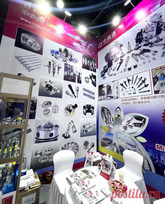На изображении представлена выставочная кабина на мероприятии Automec 2025 в Сан-Паулу, Бразилия. Стенды украшены яркими фиолетовыми и розовыми баннерами с логотипами и изображениями различных автомобильных компонентов. Потолочные лампы освещают пространство, выделяя множество деталей автомобильных запчастей, которые расклеены по стенам. Видны цилиндры, поршни, форсунки и другие металлические части. Справа расположены постеры с чертежами и фотографиями, отражающими детали и инженерные разработки. В центре кадра - круглый стол, покрытый белой скатертью, на котором располагаются рекламные материалы и визитки. По бокам стола находятся белые кресла, предлагающие комфортное место для переговоров. В общем, атмосфера характеризуется как профессиональная и технологичная, акцентирующая внимание на точности и инновациях, представленных брендом. Визуальное оформление нацелено на привлечение внимания посетителей к разнообразию и качеству предлагаемой продукции.