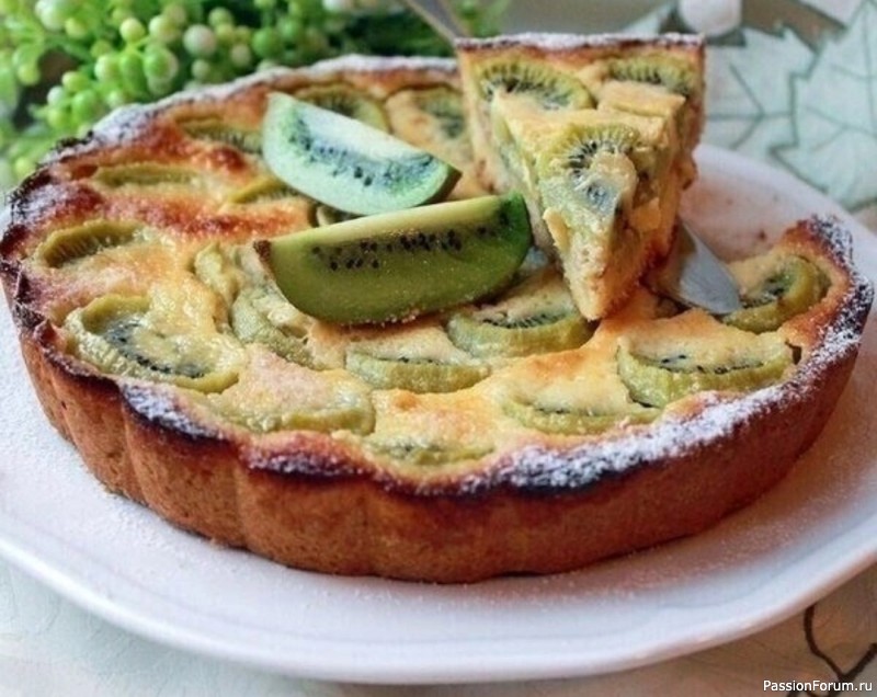На изображении представлена аппетитная творожная запеканка с фруктами, расположенная на белой тарелке. Основную часть запеканки занимают дольки киви, которые украшены сверху. В центре запеканки аккуратно уложены ломтики банана, добавляя контрастные оттенки зеленого и желтого цветов. Верхушку блюда слегка посыпали сахарной пудрой, придавая ему более изысканный вид. Один кусок аккуратно вырезан и поднят лопаткой, демонстрируя нежную внутри текстуру и полноту фруктовых наполнителей. Фон украшен зеленым растительным декором, что добавляет свежести общей композиции. Запеканка выглядит гармонично и празднично, идеально подходя для подачи на десерт. Присутствующий логотип "postila.ru" на изображении может указывать на источник или бренд, связанный с рецептом блюда. Атмосфера изображения тепло и уютно располагает к домашней кулинарии.