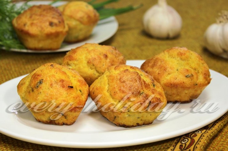 На изображении представлены аппетитные маффины, приготовленные на кефире с добавлением чеснока, зелени и брынзы. Они расположены на белой тарелке, создавая контраст между ярко-золотисто-коричневой корочкой маффинов и белизной посуды. На заднем плане видно блюдо с дополнительными маффинами, рядом с которым размещены пучок свежей зелени и несколько головок чеснока. Это придает композиции кулинарную атмосферу уюта и домашнего тепла. Маффины выглядят питательными и аппетитными, что способствует приятной текстуре помещения. Фон украшен в теплых коричневых тонах, что подчеркивает комфортное восприятие изображения.