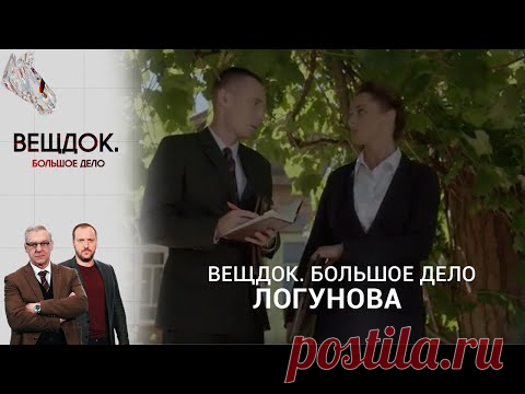 На изображении представлена сцена из, вероятно, телевизионного шоу или сериала, связанного с расследованиями. На переднем плане изображены два человека, мужчина и женщина, одетые в деловые костюмы. Они находятся на улице, под деревьями, и обсуждают какие-то записи, которые мужчина держит в руках в виде блокнота или папки. Действие происходит на фоне зелени и частично видимого здания. На правом плане можно увидеть крупный текст: "ВЕЩДОК. БОЛЬШОЕ ДЕЛО ЛОГУНОВА". Слева изображены двое мужчин, тоже в деловых костюмах, в формальной позе, что добавляет серьезности сцене. Верхняя и нижняя части изображения содержат другие тексты и логотипы, которые могут указывать на название шоу или канала. В общем, атмосфера изображения передает серьёзность и сосредоточенность, частично благодаря темным и формальным нарядам участников.