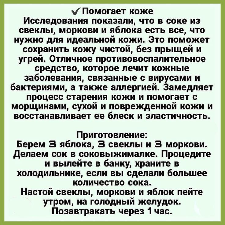 На изображении представлено текстовое описание на русском языке, относящееся к уходу за кожей при помощи сока из овощей и фруктов. Основной цвет фона - светло-зеленый, контрастирующий с черным шрифтом текста, создающим четкое визуальное восприятие. Текст объясняет полезные свойства сока из яблок, свеклы и моркови, подчеркивая его антивозрастное и противовоспалительное действие, очищающее кожу от прыщей и угрей, а также замедляющее процессы старения кожи. Способ приготовления сока тоже детально описан: требуется взять равные части яблок, свеклы и моркови, приготовить сок в соковыжималке и хранить в холодильнике. Рекомендуется употреблять натощак. В нижнем правом углу присутствует светло-красный текст, ненавязчиво дополняющий общую композицию. Стиль текста скорее информационный, направленный на заботу о здоровье и красоте кожи.
