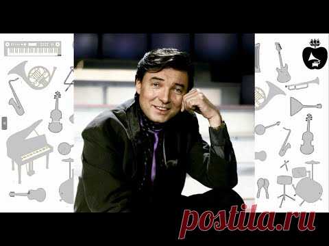 Изображение представляет собой фотографию мужчины с тёмными волосами, одетого в чёрный костюм с фиолетовым галстуком. Его поза выглядит расслабленной, он поддерживает голову рукой и выражает доброжелательную улыбку. Вокруг размытое освещение, создающее мягкую атмосферу. Фон слегка затемнён, что придаёт глубину изображению и привлекает внимание к центральной фигуре. По краям композиции видны графические изображения различных музыкальных инструментов, включая пианино, саксофон, барабаны и другие. Это добавляет тематический элемент, связанный с музыкой и творчеством. Контекст присутствия текста "Карел Готт – золотой голос Чехии" подразумевает музыкальную карьеру изображённого. Общая атмосфера изображения пропитана чувством уважения к искусству и артистическому достижению.
