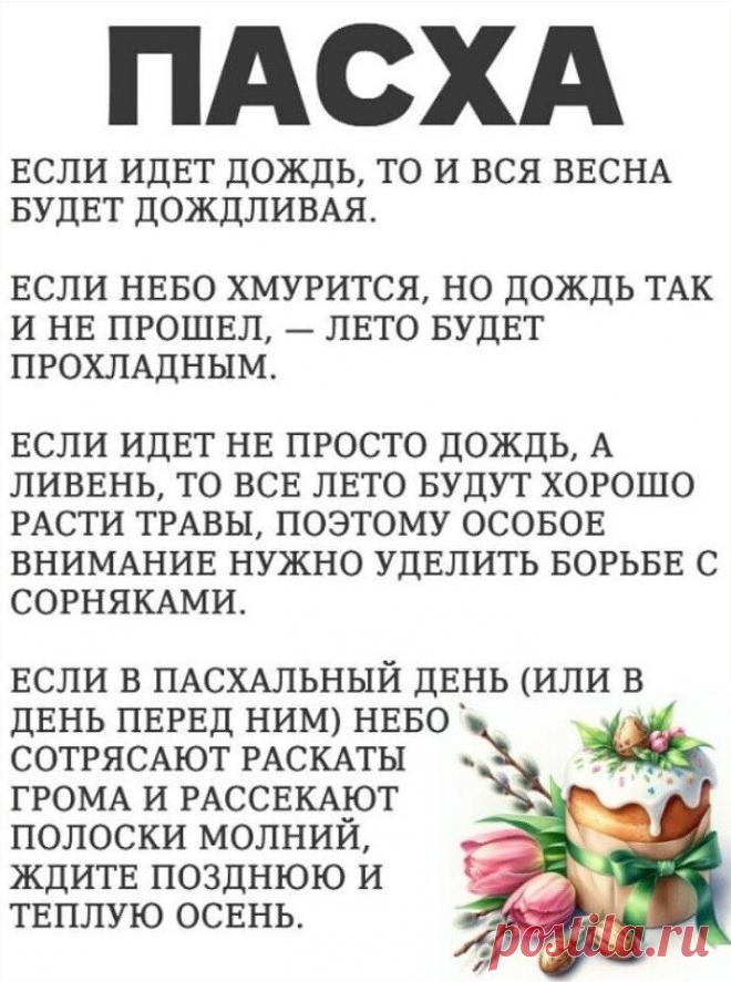 На изображении текст на русском языке, посвящённый народным приметам на Пасху, связанным с погодными условиями. Заголовок "ПАСХА" набран крупным чёрным шрифтом на белом фоне. Текст сообщает, что если в этот день идёт дождь, весна будет дождливой; если небо хмурится, но дождя нет, то лето будет прохладным. При сильном ливне летом хорошо растут травы, что требует борьбы с сорняками. Грозы и молнии в Пасхальный день обещают тёплую осень. В нижней части изображения справа расположена маленькая красочная иллюстрация с пасхальным куличом, сбоку которого лежат яркие, декорированные цветные яйца и ветки вербы, что добавляет праздничную атмосферу. Эта иллюстрация подчёркивает традиционные праздничные элементы, связанные с Пасхой. Внизу логотип или надпись на красном фоне.