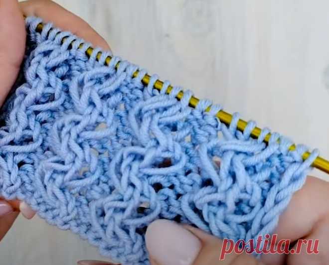 На изображении видно, как женщина держит в руках вязание спицами, создавая сложный ажурный узор из светло-голубых ниток. Пряжа переливается на свету, показывая текстуру и плотность вязания. Спицы - металлические, золотистого цвета, что придаёт изображению яркий акцент. Руки женщины аккуратны, с светлым маникюром, что добавляет элемент утонченности. На фоне можно заметить светлую деревянную поверхность, создающую тёплую и уютную атмосферу. Узор на вязании сочетается с кружевными мотивами, подчёркивая сложность и мастерство техники, что вызывает ощущение спокойствия и творчества. Вязание спицами всегда ассоциировалось с традициями и домашним уютом, и данное изображение идеально передаёт эти чувства через цветовую палитру и текстурированную поверхность материала.