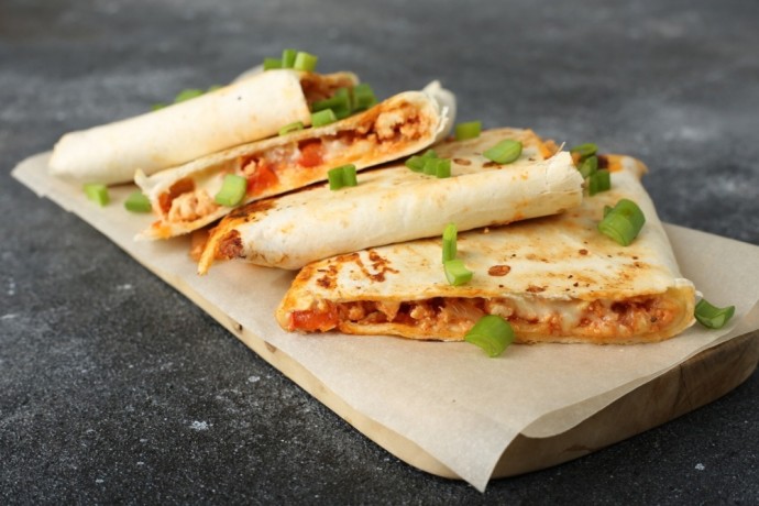 Кесадилья с курицей Ингредиенты:Тортилья — 6 шт.Фарш куриный — 400 г Перец болгарский — 0,5 шт. Кукуруза консервированная — 50 г Лук репчатый — 75 г Лук зеленый — 1 веточка Чеснок — 2 зубчика Вода — 100 мл Томатная паста...