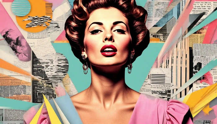 Изображение представляет собой яркую композицию в стиле поп-арт. В центре изображена женщина с выразительным макияжем и ярко-красной помадой. Её волосы уложены в винтажной стиле 1950-х годов, создавая эффектные волны. Она одета в розовое платье с открытыми плечами и серьгами в виде крупных подвесок. Её уверенная поза и взгляд, направленный прямо на зрителя, создают ощущение харизмы и уверенности. На заднем плане изображены абстрактные геометрические формы в пастельных тонах, а также элементы в виде газетных вырезок и городских пейзажей, что придаёт картине динамичность. Источники света ненавязчивы, создавая мягкие тени, акцентирующие черты её лица. Изображение сопровождается текстом "[тест] Что твой тембр голоса говорит о твоем характере? — Тесты | Уверенная и харизматичная", что подчеркивает тему уверенности и харизмы через голос и стиль.