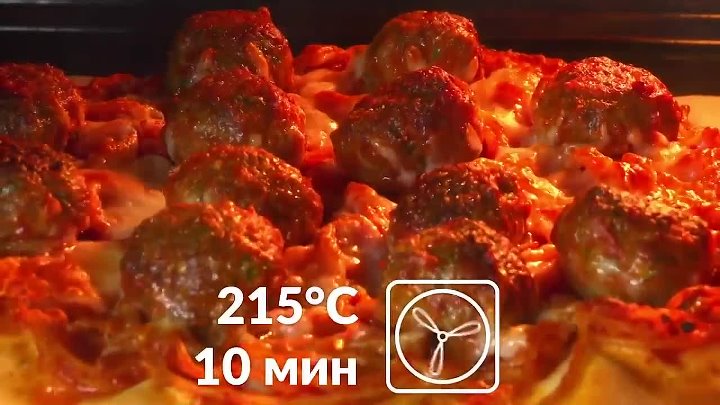 На изображении запечатлен процесс приготовления блюда в духовке при температуре 215°C в течение 10 минут. Блюдо представляет собой сочные мясные фрикадельки, покрытые золотистой корочкой, которые находятся в процессе запекания. Их текстура аппетитная и румяная, сочетающаяся с томатным соусом и сыром, плавящимся между фрикадельками и создающим тягучий эффект. Красные и оранжевые оттенки придают блюду тепло и насыщенность. Контраст между тёмными и светлыми участками способствует восприятию объёма и глубины. Компоненты блюда симметрично выложены, создавая гармонию в композиции. Окружение духового шкафа едва различимо, но тёплое освещение подчёркивает аппетитные свойства еды. Такие блюда вызывают ощущение домашнего уюта и кулинарного мастерства, что характерно для традиционной кухни. Изображение вызывает кулинарный интерес и желание приступить к готовке.