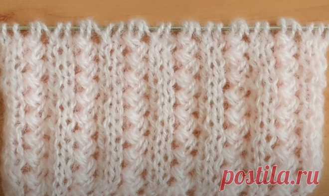 На изображении представлена ажурная вязка из толстых светло-розовых нитей с блестящей текстурой, создающая воздушный и легкий узор. Этот узор связан спицами, что придаёт ему выраженный объём и текстурированность. Нити плотно переплетены, что создаёт красивые вертикальные линии, отличающиеся равномерностью и симметрией. На фоне видно деревянную поверхность, которая придаёт контраст и подчёркивает естественную красоту вязки. Общее освещение мягкое, создающее тёплую и уютную атмосферу. В нижнем правом углу изображения можно заметить текст, написанный красным курсивом на русском языке, что добавляет дополнительный визуальный элемент. Эта вязка идеально подходит для создания таких предметов одежды, как туники, маечки и джемперы. Видимый паттерн в сочетании с деликатным цветом передаёт чувство лёгкости и романтики, что делает его подходящим для весеннего и летнего гардероба.