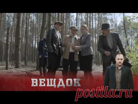 На изображении группа людей находится в лесу, окружённом высокими соснами, создающими естественный фон. Люди выглядят сосредоточенно, их одежда соответствует стилю 20 века: пальто, шляпы и строгие костюмы. Женщина в центре сцены держит заметки или бумаги, общается с другими, что придаёт ситуации деловой характер. В её лице видна решительность и профессионализм. Слева человек в тёмной одежде наблюдает за происходящим на расстоянии. Изображение освещено естественным светом, что подчёркивает текстуру материалов и землистые цвета сцены. Присутствуют винтажные элементы, указывающие на детективный сюжет, в который может быть вовлечена женщина, которую оставили висеть на собачьем ошейнике из-за её предательства. На переднем плане подпись "Вещдок", на красном фоне, что добавляет серьёзности и драматизма сцене. В нижнем правом углу изображён. человек, рассматривающий зрителя, связывая текущую сцену с более широким контекстом событий.