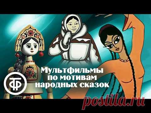 Изображение представляет собой коллаж из трех анимационных персонажей, передающих атмосферу народных сказок. На переднем плане слева находится кукла в традиционном русском наряде, с ярким кокошником, украшенным орнаментом, и круглыми ярко-красными серьгами. У нее большие выразительные глаза и серьёзное выражение лица, погружающее в мир русских сказок. В центре изображена фигура в традиционной одежде народов Севера, что отражает тему зимних сказок. Её защитное облачение из меха заставляет ей выглядеть уютно и тепло, она улыбается, вызывая чувство доброжелательности. Справа изображена изящная фигура с длинными тёмными волосами, одетая в легкий оранжевый костюм. Её поза свидетельствует о движении, танце, и она смотрит на зрителя с лёгкой насмешкой. Фон составляет голубой градиент с плавными переходами, создающий эффект глубины. В композиции также виден логотип с двумя пересекающимися буквами и текст, объединяющий все элементы вокруг темы мультфильмов на основе народных сказок.