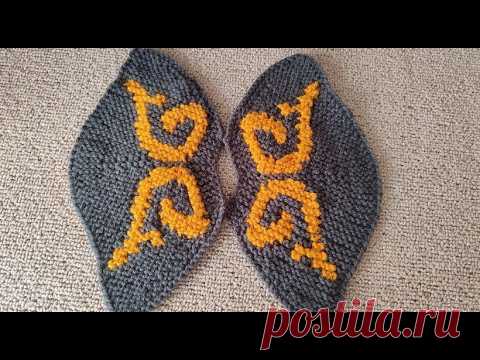 На изображении представлена пара вязаных изделий, которые напоминают тапочки. Они выполнены из серой пряжи с оранжевым узором, напоминающим стилизованные растительные мотивы. Изделия имеют форму двух листовидных элементов, которые совмещаются по центру. Теоретически, узор может представлять собой традиционные орнаменты, что придаёт им культурную значимость. Узоры вязаны плотной текстурой, что создаёт ощущение тепла и уюта, а цвета - серый и оранжевый - создают гармоничный контраст. Фон выполнен в светло-сером цвете, что подчеркивает основное изображение. Светлая ткань, на которой лежат изделия, делает акцент на их текстурной структуре. Эта композиция привлекает внимание не только своим дизайном, но и возможностью эмоциональной ассоциации с домашним уютом и заботой, что подчеркивается видимой надписью "Тапочки для любимых мужчин". Изображение создает впечатление рукоделия и творчества, акцентируя внимание на важности детали в создании уютной атмосферы.