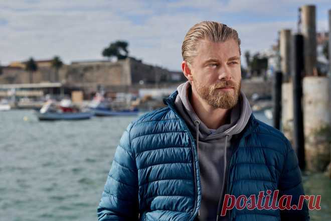 На изображении изображен мужчина с густой светлой бородой и светлыми волосами, приглаженными назад. Он одет в стеганую куртку синего цвета поверх серого худи, что создает стильный и современный образ. Поза мужчины расслабленная, взгляд направлен в сторону, что придает снимку атмосферу размышлений и задумчивости. На фоне видны морские воды и лодки, что указывает на портовую сцену. Солнечное освещение выгодно подчеркивает детали текстуры одежды и создает мягкие тени на лице. Часть изображения занимает берег с постройками, выполненный в стиле местной архитектуры. Направление света слева добавляет глубину и выделяет передний план от заднего. Вдалеке можно увидеть деревья и здания, что свидетельствует о приморском поселении. Заметны элементы, характерные для береговой линии, такие как пристань на заднем плане, которые усиливают ощущение нахождения у моря. Атмосфера спокойная, возможно, подходящая для медитативного отдыха. Текст "Люк Митчелл, 17 апреля, 1985" естественно вписывается в общую композицию, добавляя личностный акцент.