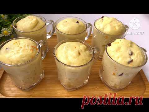 На изображении представлены шесть прозрачных стеклянных кружек, наполненных выпечкой, напоминающей куличи. Куличи имеют светло-золотистый цвет и слегка подрумяненную корочку. В тесте видны вкрапления изюма и цукатов, что придаёт особую текстуру. Кружки размещены на деревянной доске, что добавляет натуральности и тепла общей композиции. Артель из шести кружек создает симметричный и упорядоченный вид, посередине кадра, обеспечивая сбалансированность изображения. Фон светлый, а стиль освещения приглушённый, что подчёркивает праздничный и домашний характер блюда. Внизу изображения текст указывает на простоту и гениальность приготовления кулича в кружке, что может быть полезно и вдохновляюще для домашних кулинаров.