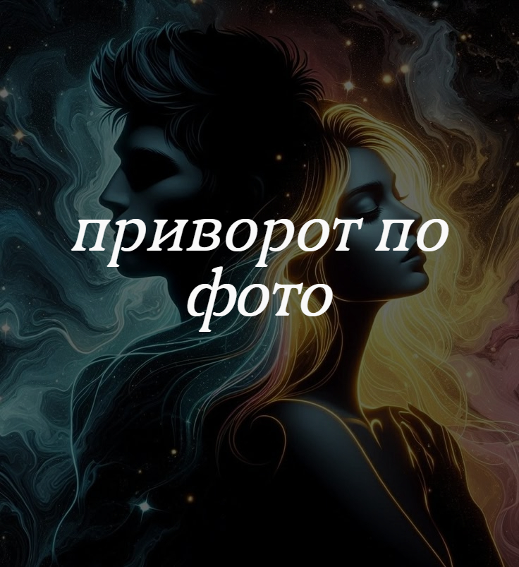 На изображении представлены тени двух людей, профиль которых выполнен в темных оттенках с плавными, космическими переходами, создающими ощущение загадочности и магии. Фоны разделены: с одной стороны присутствуют тёмно-синий и чёрный цвета, а с другой – тёплые жёлтые и оранжевые оттенки. Это создает контраст, указывая на символическое противостояние или гармонию между двумя противоречивыми элементами. Линии и текстуры фона напоминают движения энергии, и имеются звёздные вкрапления, придающие изображениям элемент космоса и бесконечности. Композиция изображения сосредоточена на профилях, создавая ощущение баланса и симметрии. В центре размещён текст на русском языке, указывающий на возможную тематику изображения – действие, связанное с магией, а именно "приворот по фотографии". Светлая и тёмная стороны фона сопоставляются, возможно, символизируя два противоположных мира или состояния. Атмосфера таинственная и романтично-мистическая, усиливая ощущение магического ритуала или мистического действия.
