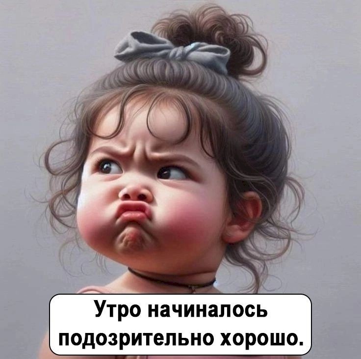 На изображении изображен ребенок с выразительной и капризной гримасой. У нее круглолицое лицо, пухлые щеки и брови нахмурены, создавая впечатление недовольства или раздумья. Глаза широко открыты, выражая концентрацию. Волосы убраны в небрежный пучок, заколоты серым бантом, что придает образу дополнительную милоту. Свет рассеянный и мягкий, подчеркивающий детальные черты лица и текстуру кожи. На голове видны мелкие локоны, придающие еще больше шарма этому юному персонажу. Ребёнок одет в простой топ, а фон нейтральный, светло-серый, что позволяет сосредоточиться на выражении лица. Внизу изображения присутствует текст: "Утро начиналось подозрительно хорошо", что добавляет элемент юмора и создает эффект неожиданного контраста между детским образом и недружелюбным выражением лица. Эмоциональная атмосфера фотографии полной неоднозначности, сочетающей миловидность и скрытую иронию, создавая атмосферу неожиданности и подчеркивая разницу между внешним видом и выражением его внутренних эмоций.