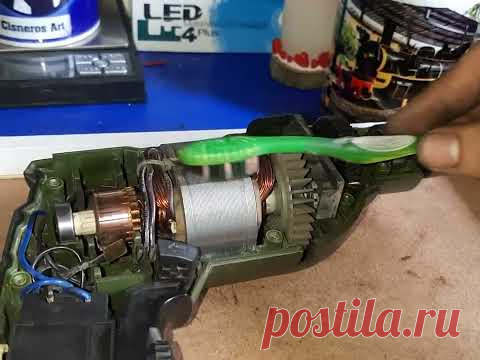 На изображении показан процесс обслуживания электрического инструмента, вероятно, дрели. Центральным объектом является аппарат, разобранный для более точного доступа к внутренним частям. Видны витки медной проволоки ротора, окруженные серыми металлическими элементами, фиксируемыми в корпусе из тёмно-зелёного пластика. Рядом с дрелью держится зубная щётка с зелёной ручкой, используемая для удаления пыли и грязи. Человеческая рука в верхнем правом углу аккуратно держит щётку над деталями. Фон сцены заполнен синими и белыми тонами, с видимыми надписями и элементами, такими как банки с краской или химическими продуктами. Надпись "Fallas más comunes en taladros, reparación y mantenimiento preventivo. Tutorial fácil y rápido." гармонично соотносится с процессом демонстрации очистки и ремонта инструмента, создавая впечатление обучающего момента.