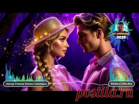 На изображении представлен романтический момент между двумя молодыми людьми, мужчина и женщина нежно смотрят друг на друга. Женщина с длинной светлой косой и в соломенной шляпе украшенной мерцающими огоньками. Мужчина в светлой рубашке, его прическа аккуратно уложена. Фон напоминает волшебный лес с фиолетовыми и розовыми оттенками, создающими атмосферу волшебства и романтики. В нижней части изображения графики напоминают музыкальные волны, что создает ощущение музыкального ритма. Также присутствуют текстовые элементы "Автор стихов Роман Синицын" и "DJ СИНИЦЫН - Ближе, чем мой друг". Световые блики и мягкое освещение добавляют глубину и теплоту фотографии.