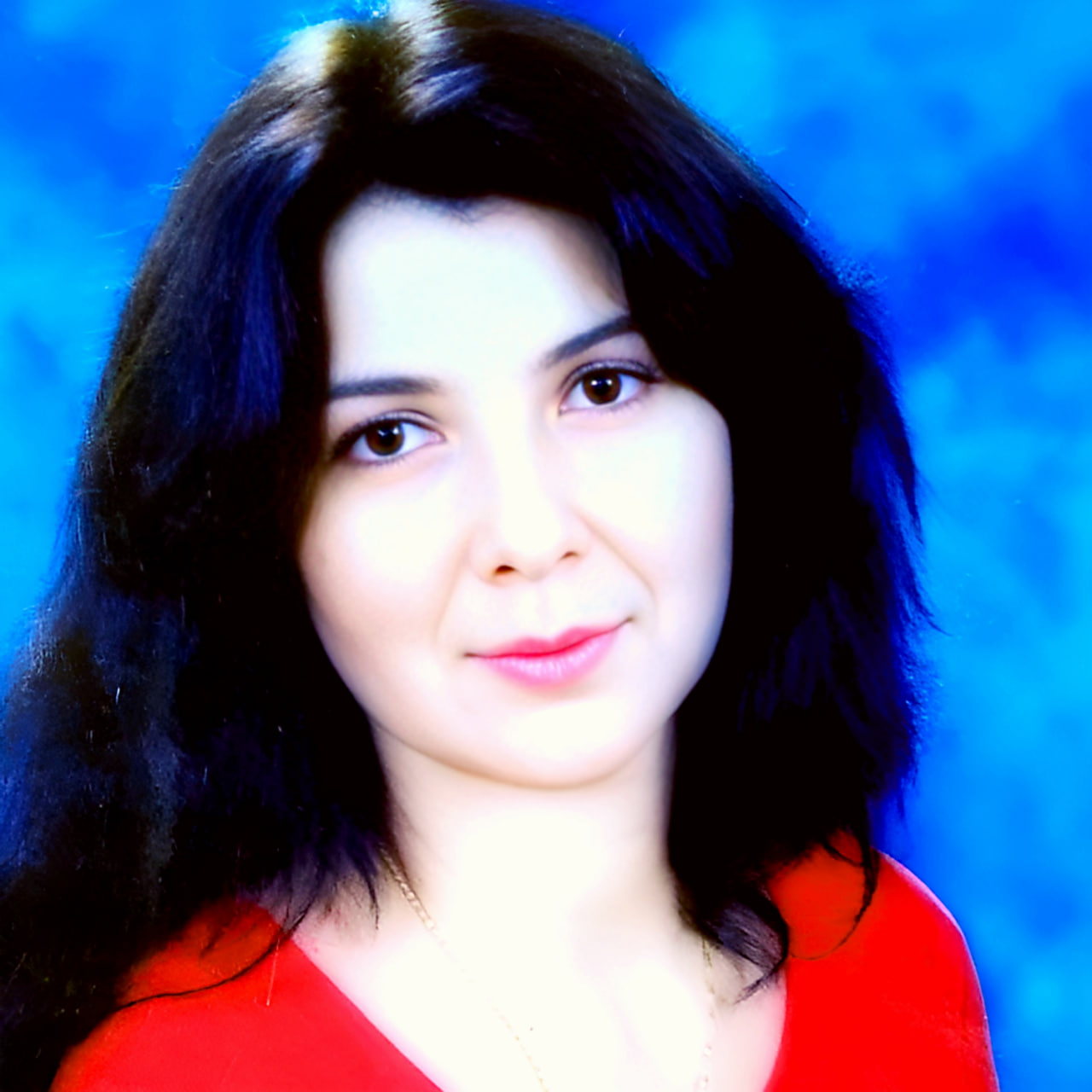 На изображении представлена женщина с длинными тёмными волосами, которая смотрит прямо на зрителя с мягкой улыбкой. Её взгляд спокойный и доброжелательный. Женщина одета в ярко-красную одежду, которая подчёркивает контраст с её светлой кожей и тёмными волосами. Фон фотографии представлен в насыщенном синем цвете, создавая ощущение глубины и спокойствия. Освещение мягкое и равномерное, что придаёт изображению тёплую и жизнерадостную атмосферу. Композиция изображена крупным планом, акцентируя внимание на лице и выражении чувств. Мягкие тени создают впечатление трёхмерности, придавая снимку живость и естественность. Её лёгкая, едва заметная улыбка и выражение глаз говорят о доброжелательности и спокойствии. Внизу изображения находится текст "Ҳусния Содиқовага табрик", что может быть связано с поздравлением или личным обращением, добавляя изображению личный и интимный характер.