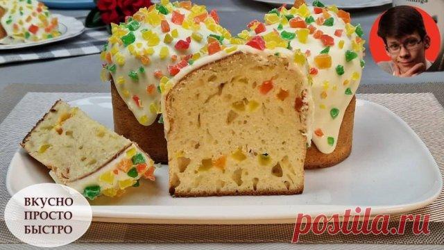 На изображении видно аппетитное пасхальное блюдо — кулич с творогом, ставшее семейной традицией. В центре композиции находится крупный кусок кулича на белой тарелке, разрезанный, чтобы показать мягкое, пористое тесто с вкраплениями разноцветных цукатов. Верхушка украшена белой глазурью, из которой весело смотрят такие же яркие цукаты. Такое оформление создает радостное весеннее настроение. На заднем плане видно еще несколько аналогичных куличей, минималистично украшенный стол, что придает атмосферу семейного праздника. На изображении также присутствует яркий элемент в правом верхнем углу — фотография человека на красном фоне. Освещение ровное, натуральное, без резких теней, что подчеркивает свежесть и привлекательность блюда. На изображении представлен производитель с надписью "Пасха на Пасху — просто и быстро! Творожный рецепт, ставший семейной традицией" — это подчеркивает простоту и легкость в приготовлении блюда.