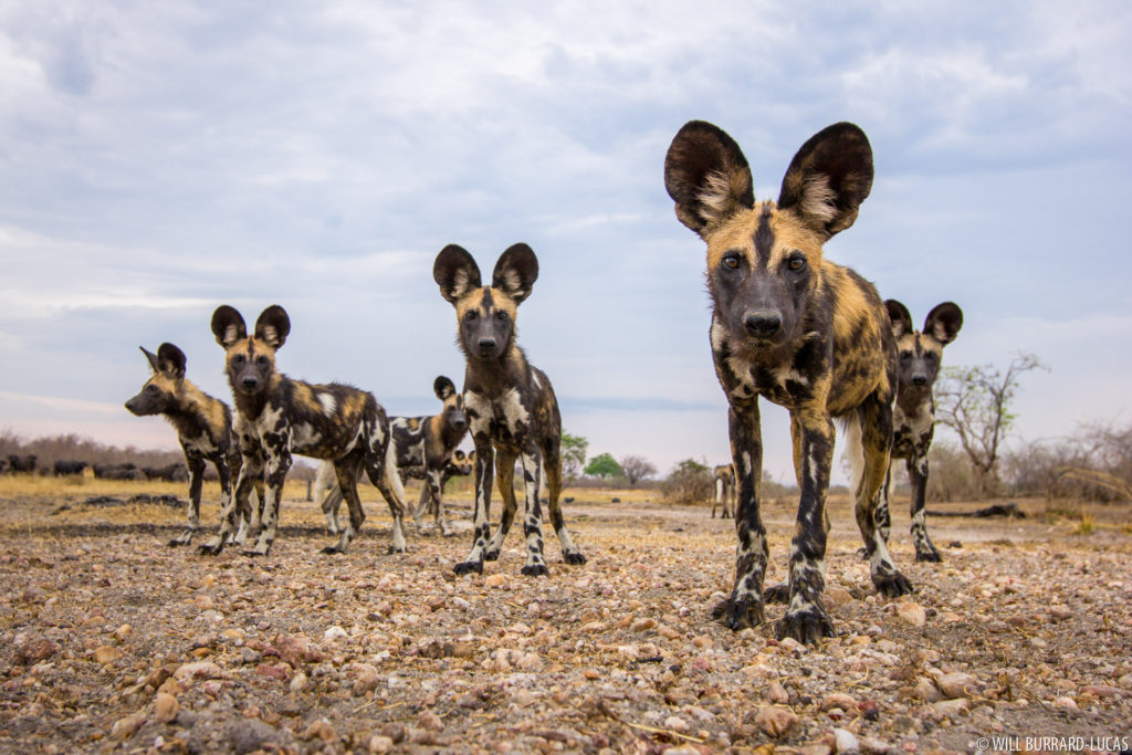 На изображении запечатлены несколько африканских диких собак на фоне саванны. Центральная фигура – собака с большими, настороженно направленными вперед ушами. Остальные собаки видны на заднем плане, расположившись в разных позах и ракурсах. Их шерсть имеет пятнистую окраску, сочетание черного, белого и рыжего цветов, что позволяет им сливаться с окружением. Текстура шерсти собак кажется гладкой и ухоженной. Взгляд собаки на переднем плане сосредоточен и насторожен, что придаёт изображению динамичность и живость. Днем, видимо, облачно, так как освещение рассеянное и мягкое. Почва под ногами собак представляет собой сухую, каменистую поверхность, характерную для засушливых областей Африки. Вдалеке видны низкие деревья и кустарники, характерные для африканской саванны. Небо на заднем плане укрыто облаками, создавая ощущение глубины и перспективы. Весь состав сцены напоминает кинематографический кадр с акцентом на внимание и готовность собак к действию.