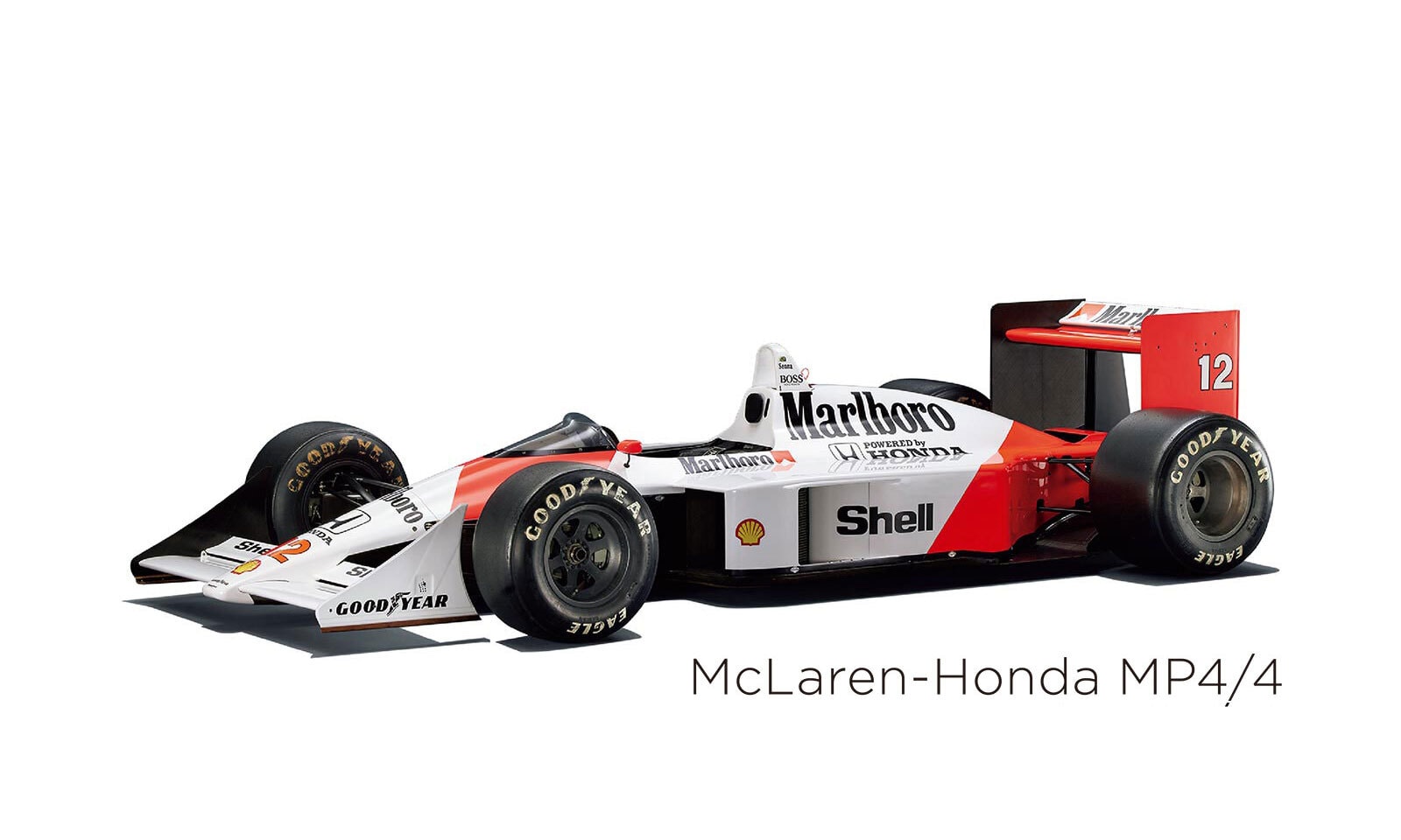 На изображении представлен гоночный болид McLaren-Honda MP4/4, знаковый автомобиль Формулы-1 конца 1980-х годов. Его корпус выполнен в яркой бело-красной цветовой гамме, характерной для того времени, с отчетливо выделяющимися логотипами Marlboro и Shell, указывающими на спонсоров команды. Четкие линии и аэродинамичные формы шасси подчёркивают его спортивный характер. На переднем и заднем спойлерах видны надписи Goodyear, свидетельствующие о производителе шин. На фоне изображение отделено от земли белым фоном, создавая иллюзию парящей формы, францирование на правую сторону придаёт динамику и направленность движению автомобиля. Автомобиль кажется мощным и готовым к скоростному заезду. Освещение мягкое, без резких теней, что позволяет рассмотреть все детали. Виден номер 12 на заднем крыле, который возможно ассоциируется с автомобилем известного гонщика. "Hondas History | Honda Global Corporate Website" упоминается в связи с историческим значением данного болида в контексте бренда Honda, подчеркнув его вклад в автоспорт и инновации.