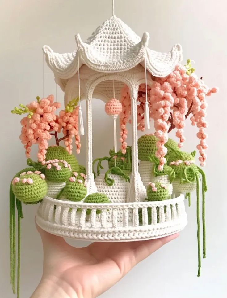 На изображении показана изящная вязаная модель беседки, которая выполнена из белой пряжи. Беседка имеет сложную ажурную крышу в восточном стиле и поддерживается тонкими колоннами. Внутри и вокруг конструкции расположены декоративные элементы из зеленой и розовой пряжи, имитирующие растения и цветы. Композиция напоминает миниатюрный сад. Нить светло-зеленого цвета формирует ветви с листвой. Розовые вязаные элементы изображают свисающие цветы, возможно, глицинии, придавая всей работе нежность. Конструкция удерживается рукой человека в нижней части, создавая впечатление легкости и ручной работы. Фон светлый, без лишних деталей, что позволяет сосредоточиться на мастерстве вязания и тонкой работе с цветами и формами.