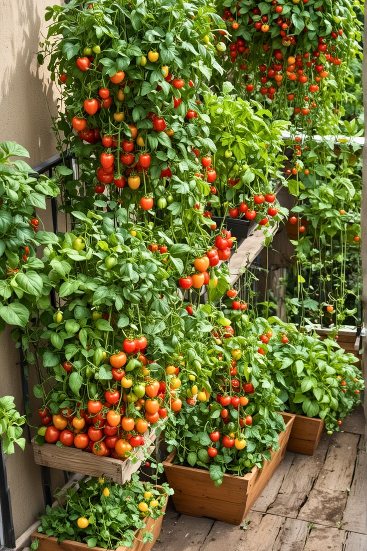 На изображении видна небольшая городская терраса с плотной растительностью, где доминируют кусты томатов. Яркие красные и жёлтые помидоры свисают гроздьями с густых зелёных кустов, что создаёт яркий контраст. Томаты растут в деревянных ящиках, что подчёркивает деревенский стиль и практичность оформления. Стены террасы окрашены в нейтральный светлый цвет, который гармонирует с яркой растительностью. Свет естественный, дневной, мягко освещает всю сцену, подчёркивая свежесть листьев. Вдоль перил террасы растут ещё несколько растений в похожих контейнерах, образуя вертикальный сад. Композиция создаёт впечатление уюта и экологичности, символизируя городской огород, который также является экологически устойчивым решением. Образ террасы говорит о стремлении к самовыращиванию и поддержке экологических инициатив.