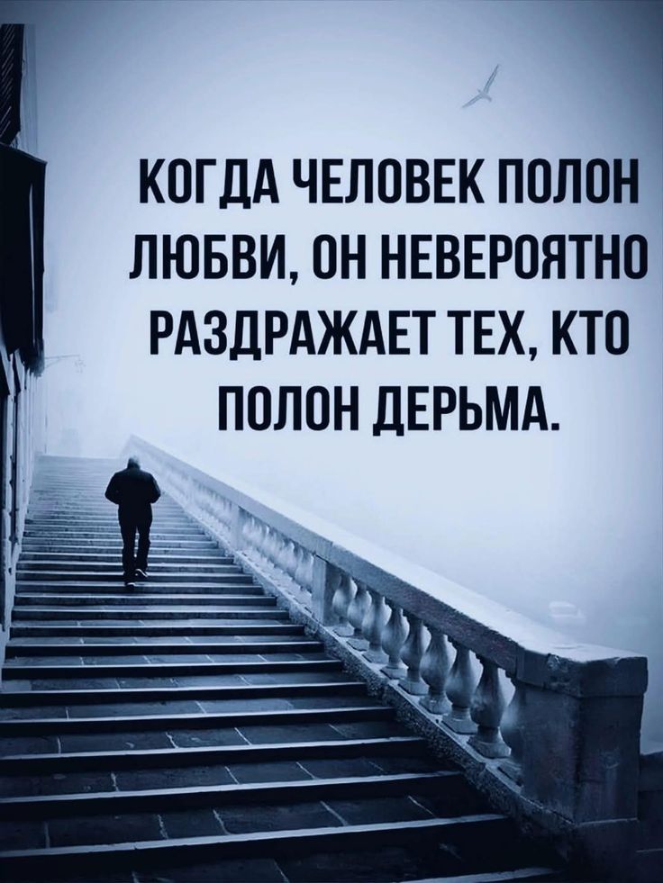 На изображении представлен человек, идущий вверх по каменной лестнице с массивными перилами. Его фигура одета в тёмное, создавая контраст с окружающим серо-голубым фоном, что придаёт сцене драматичность. Действие происходит, скорее всего, в утреннее или вечернее время, что подчёркивается мягким, рассеянным светом. В верхней части кадра, на фоне неба, летит птица, добавляя динамики. На изображении также имеется текст на русском языке: «КОГДА ЧЕЛОВЕК ПОЛОН ЛЮБВИ, ОН НЕВЕРОЯТНО РАЗДРАЖАЕТ ТЕХ, КТО ПОЛОН ДЕРЬМА.» Это высказывание вызывает размышления о человеческих отношениях и эмоциональном состоянии. Стиль изображения минималистический, с акцентом на текст и фигуру человека на лестнице. В нижнем правом углу виден логотип сайта, подчёркивающий источник изображения. Компоновка кадра добавляет глубину, а перспектива лестницы ведёт взгляд в бесконечность.