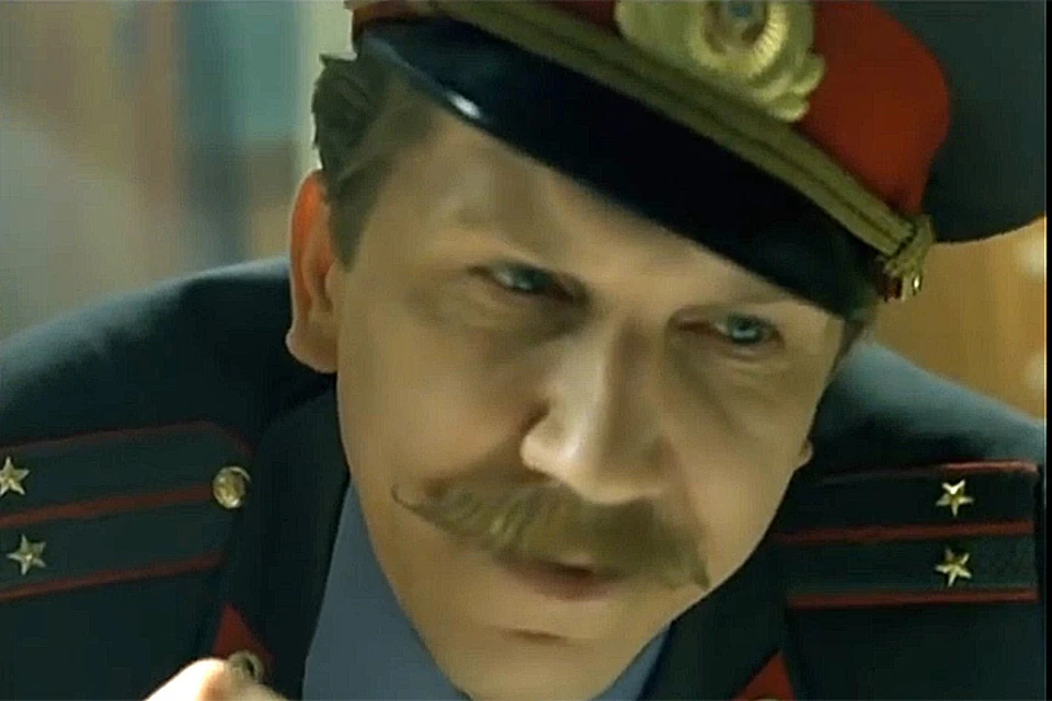На изображении изображён мужчина в форме советского офицера милиции. На нём тёмно-синяя офицерская униформа с погонами и золотыми звездами, а также фуражка с красной полосой и эмблемой. Его лицо сосредоточено, он смотрит вперёд с интенсивным и изучающим взглядом, создавая ощущение концентрации или допроса. Глаза мужчины голубые, и он носит густые усы, подчёркивающие серьёзность его выражения. Освещение приглушённое, акцентирует внимание на чертах его лица, создавая атмосферу интриги и драмы. На заднем плане размытой фокусировкой виднеется интерьер, что добавляет глубины изображению. В правом нижнем углу присутствует текст на кириллице. Известное имя Сергей Баталов ассоциируется с культурным контекстом изображения.