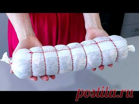На изображении показаны женские руки, держащие колбасу, завернутую в белую бумагу и обвязанную красной нитью. Женщина одета в красное платье, что ярко контрастирует с бледным тоном бумаги, создавая сильный визуальный акцент. Освещение мягкое, с небольшими тенями, подчеркивающими объем колбасы. Кухонный фон нейтральный, серый, фокусируется на центральном объекте, не отвлекая от основного элемента. Текст ‘Новинка! Пасхальный Шедевр Без Лишних Трат! Вы Будете Готовить Его Каждый Год! Очень Вкусно!’ добавляет элемент новизны и пасхальной традиции к сцене. Заметна некоторая упрощенность, минимализм в композиции, подчеркивающий современный подход к кулинарии и домашним приготовлениям. Чистота линий и структура намекают на профессионализм и внимание к деталям. Мягкие теплые оттенки создают уютную и радушную атмосферу, что дополняет общее впечатление домашнего уюта и особенного повода.