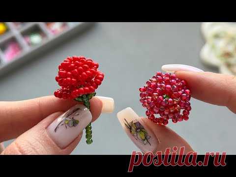 На изображении крупным планом представлены две руки, держащие миниатюрные цветы, выполненные из бисера. Цветы имеют яркие красно-зеленые расцветки, один напоминает розу с мелкими плотно размещёнными бусинами, формирующими лепестки. Второй цветок более округлый, с прозрачными и блестящими красными бисеринками. У цветов зелёные стебли из бисера. Ногти на руках ухожены и украшены рисунками жуков. Фон размыт, создавая эффект глубины, что акцентирует внимание на основном объекте. Освещение мягкое и естественное, подчеркивающее детали. Особое внимание привлекает тщательная работа, проработанность каждой детали и их изящное сочетание. Эмоциональная атмосфера изображения передает ощущение спокойствия и творчества. Всё это отражает эстетическое и ручное мастерство, типичное для руководств по созданию DIY-цветов.