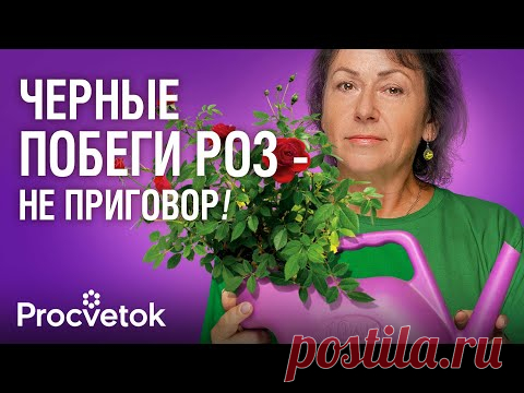 На изображении изображена женщина в зелёной футболке, держащая поливочный кувшин ярко-розового цвета и куст роз с зелёными листьями и красными цветами на фоне фиолетовой стены. Её выражение лица спокойное и уверенное, что подчёркивает серьёзный подход к садоводству. В верхней части изображения размещён текст белого цвета "ЧЕРНЫЕ ПОБЕГИ РОЗ — НЕ ПРИГОВОР!", что создаёт позитивное послание о том, что проблемы с розами можно решить. Освещение равномерное и мягкое, подчеркивающее детали лица и растения. В нижней части находится логотип с текстом "Procvstok", оформленный в белом цвете. Фотография обладает средним уровнем глубины, акцентируя внимание на женщине и розах в центре. Композиция сбалансирована, а в центре внимания находится идея о спасении растений с помощью эффективных методов ухода, подчеркиваемых сопутствующим текстом. Эмоциональная атмосфера изображения оптимистичная и вдохновляющая, призывающая пробовать новые методы в уходе за садом.
