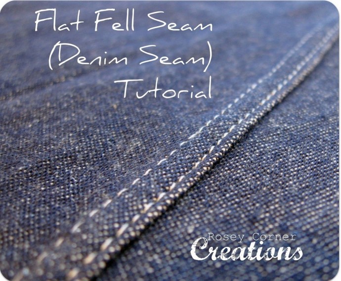 Изображение демонстрирует запошивочный шов на ткани джинсового материала. Фотография показывает крупным планом текстуру синей джинсовой ткани с явной уплотнённой строчкой, сделанной белыми нитками. Ткань представлена в естественном освещении с мягкими тенями, создающими объём и подчёркивая плотность материала. На переднем плане виден сам шов ленты, который кажется ровным и аккуратным, что свидетельствует о высоком качестве пошива. Текст на изображении на английском языке сообщает о мастер-классе по созданию данного шва, а в левом нижнем углу видны слова "Rosey Corner Creations". Углы изображения слегка округлены, добавляя мягкость визуальному восприятию. Запошивочный шов часто применяется при пошиве джинсов, что делает изделие более долговечным за счёт усиленного соединения материала.